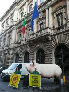 Dalle 8 di questa mattina attivisti di Greenpeace sono in azione a Roma, di fronte al ministero delle Politiche Agricole, dove hanno posizionato un gigantesco maiale che emette fumo dal naso per simboleggiare il contributo degli allevamenti intensivi alla formazione di gas serra, e rilascia un getto di acqua scura: i liquami, che inquinano suolo, acqua e aria.