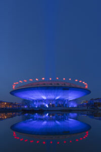 -La cupola blu che proietta la luce sopra Eindhoven è un’opera dell’artista della luce finlandese Kari Kola che quest’anno ha creato l’illuminazione della montagna “Savage Beauty” in Irlanda. Kari Kola ha ottenuto un particolare riconoscimento come artista della luce nel 2018 quando ha illuminato il famoso sito archeologico di Stonehenge, nel Regno Unito. La cupola blu crea una connessione con la natura e mira a creare consapevolezza per il pianeta.
