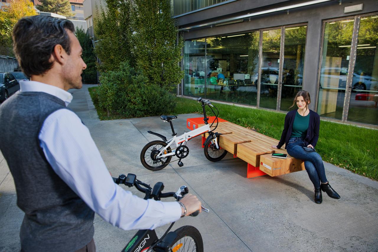 I cargobike sono progettati dallo studio del designer Makio Hasuike. A Piazza Castello anche le panchine hi-tech E-Lounge di Repower: disegnate dallo studio Lanzillo&Partners, offrono un servizio di ricarica per le biciclette a pedalata assistita e device di ogni tipo, il tutto navigando grazie all’hotspot Homo Mobilis by Repower.