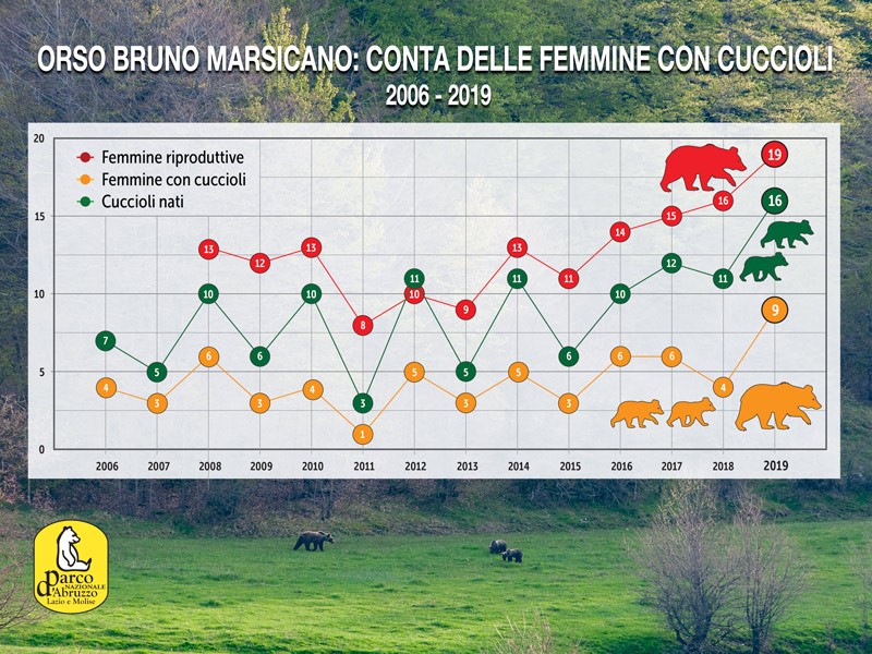 Il risultato è molto positivo in virtù del fatto che questo è il quarto anno consecutivo in cui si osservano da 10 a 16 nuovi nati nella popolazione. In ben 125 occasioni nel 2019 sono state osservate femmine con cuccioli, corrispondenti a 2 femmine con tre piccoli, 3 femmine con 2 e 4 femmine con uno solo. Accanto a questi dati incoraggianti bisogna purtroppo segnalare l’episodio dell’inseguimento con l’auto di una femmina con tre cuccioli che ha portato alla perdita di uno dei tre: https://www.facebook.com/parcoabruzzo/posts/2395361813834269