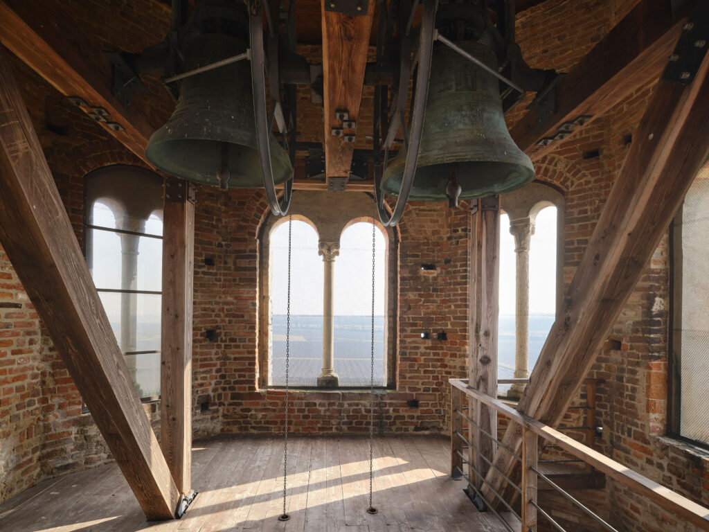 Margherita Raso (Lecco, 1991) – artista italiana tra le più promettenti della sua generazione, attenta al linguaggio della scultura e alle sue diverse forme e materiali – si è confrontata con il complesso architettonico dando vita a un’installazione scultorea realizzata con opere tridimensionali e sonore che si snodano attraverso lo spazio del Campanile della Abbazia.