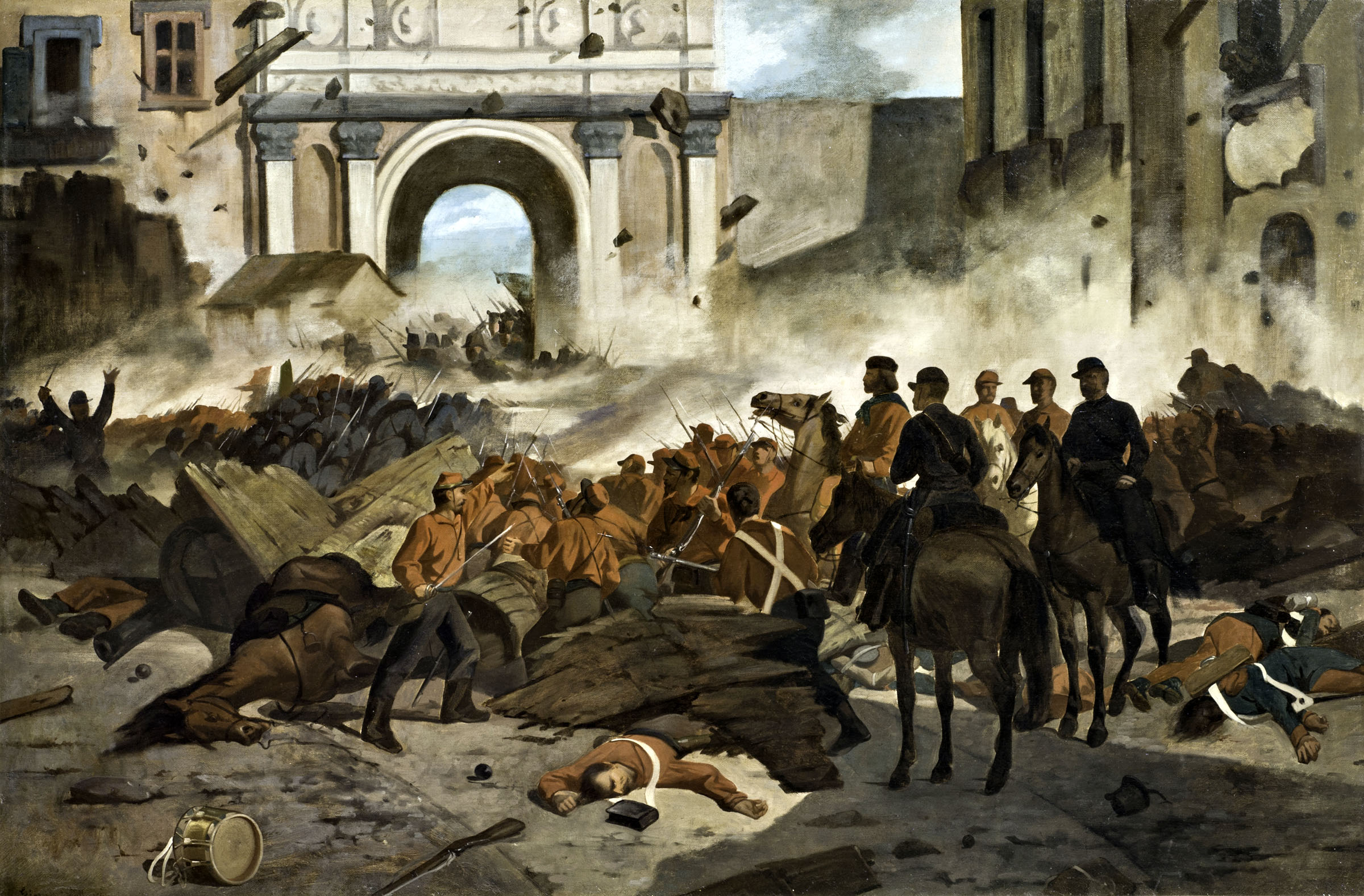 Sullo sfondo della scena ne riconosciamo la massiccia linea architettonica, nell’atmosfera resa nebulosa dai fumi degli spari, tra le macerie e i residui della battaglia, tra cavalli e uomini stramazzati al suolo e la sagoma del Generale circondata dai suoi ufficiali più fedeli.