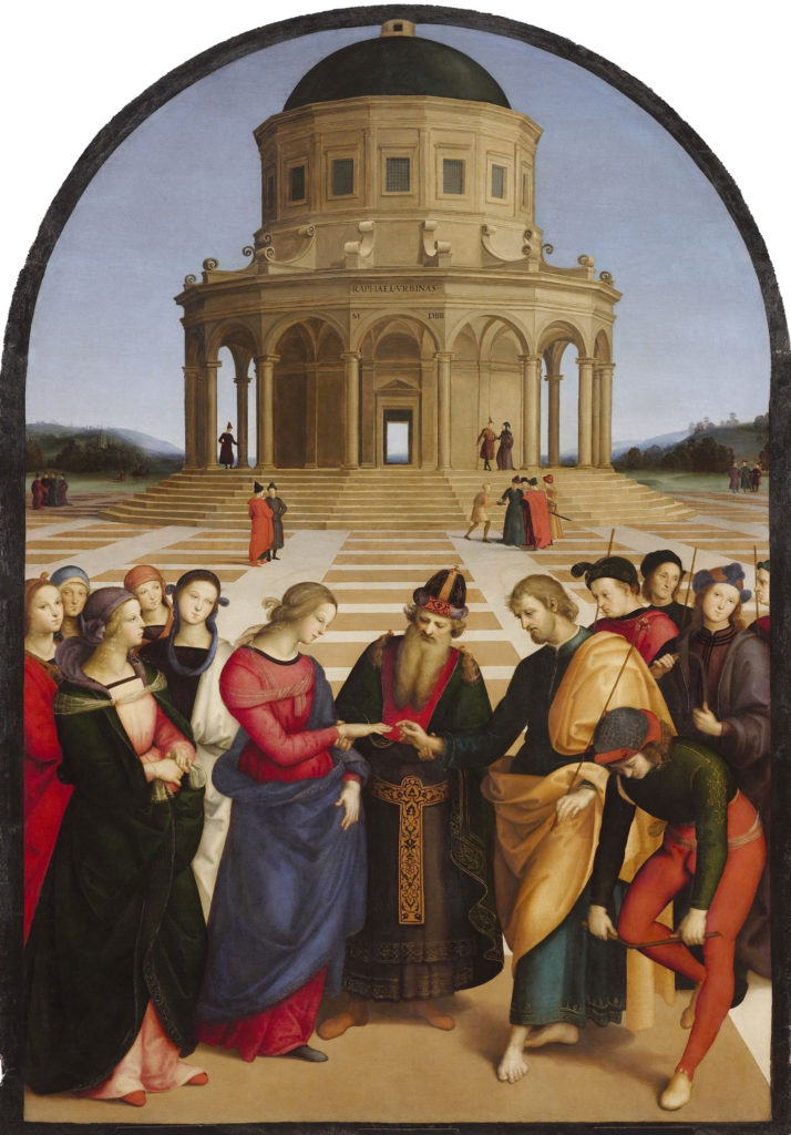 Nello Sposalizio della Vergine, dietro la scena delle nozze, il pittore di Urbino volle piuttosto celebrare un’epoca e i suoi ideali, riprendendo l’idea cinquecentesca dell’edificio centrale intorno a cui ruota lo spazio.