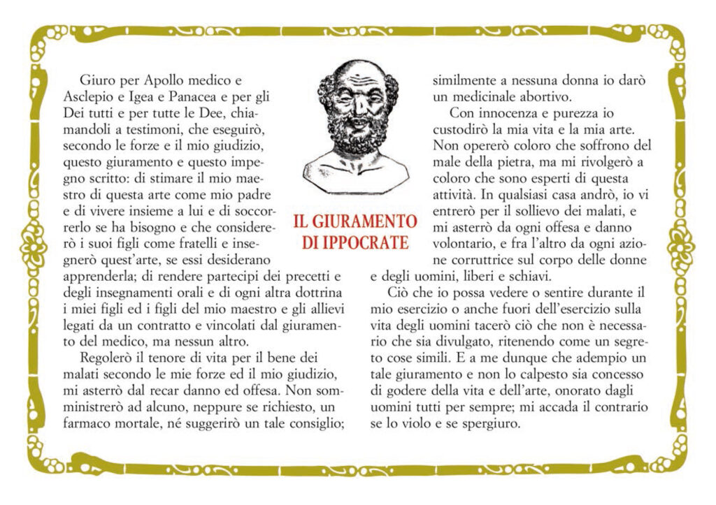 “Regolerò il tenore di vita per il bene dei malati secondo le mie forze e il mio giudizio, mi asterrò dal recar danno e offesa. Non somministrerò ad alcuno, neppure se richiesto, un farmaco mortale, nè suggerirò un tale consiglio” da il Giuramento di Ippocrate.