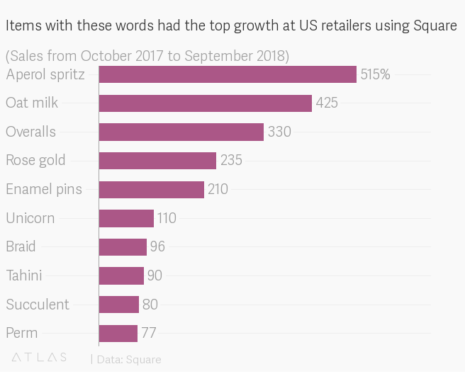 Tra gli altri prodotti maggiormente acquistati via Square ci sono, sul podio, il latte d’avena e le salopette in jeans. Seguono poi il colorante rosa per capelli, vera moda dell’anno, smalti e altri accessori. Oltre al Tahini, una salsa fatta con i semi di sesamo che dall’oriente ha conquistato i teenagers. Sì, perché sono proprio i millennial a giocare un ruolo importante in questo contesto di acquisti e trend, di cocktail e gadget. Con lo spritz che è diventato parte integrante delle loro serate.