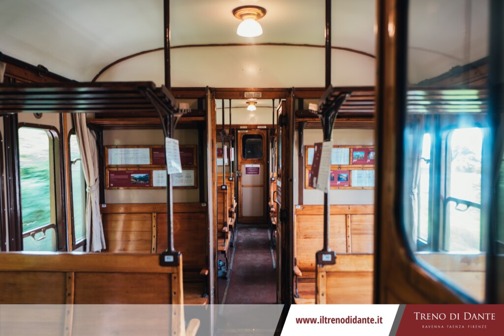Il treno circola durante i week-end fino al 14 maggio per poi riprendere le corse da settembre a novembre (non circola durante l’estate). Il convoglio storico si compone di una sola vettura di prima classe, con sedili imbottiti, rivestiti di velluto, rosso o verde, e di alcune carrozze Centoporte, sapientemente restaurate e messe a disposizione dalla Fondazione FS. Si tratta di quelle suggestive carrozze dai sedili in legno, che risalgono agli anni 30 del secolo scorso. Salire a bordo di una carrozza Centoporte ha indubbiamente già il suo fascino. Ma quello sul treno di Dante si appresta a diventare un vero viaggio di scoperta se si è attenti e curiosi. E così come Dante ebbe una Guida nel suo viaggio, un’assistente qualificata – una per ciascuna carrozza – è pronta a fornire ai passeggeri indicazioni sul treno storico, sul paesaggio che si attraversa, sui luoghi visitati dal Sommo Poeta. Lo stesso Dante, con la sua lunga veste di velluto rosso, potrebbe comparire tra le carrozze e intrattenersi con i viaggiatori, per soddisfare le loro curiosità.