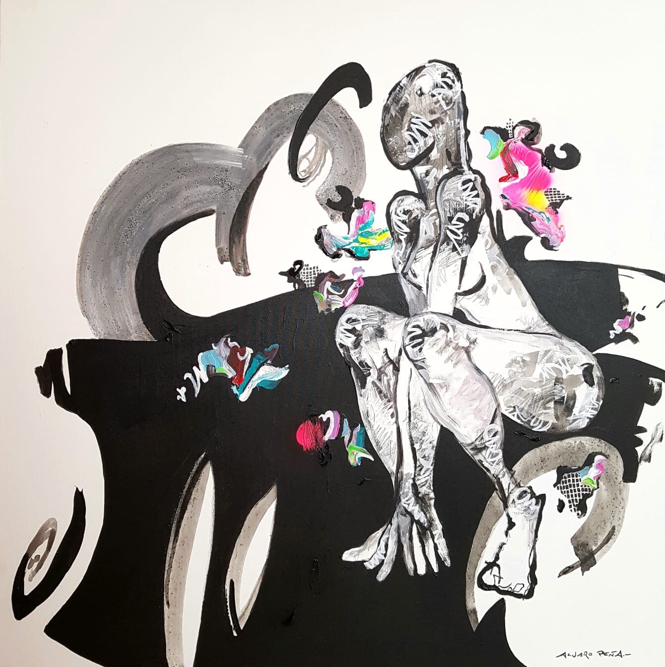 Álvaro ricerca come punto di partenza la linea, come principio e fine della sua opera. Un concetto importante perchè nell’artista murciano diventa contorno, colore, volume, materia. La linea leggera, accentuata, curva, sfumata in Álvaro Peña diventanoarmonia equilibrio, proprorzionalità. Nei lavori dell’artista Peña tutto è studiato nei minimi dettagli, il movimento, il colore, il disegno, il volume.