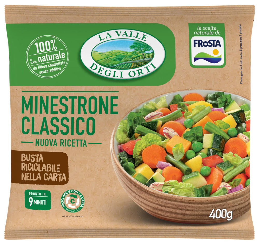 L’Italia è il primo Paese a lanciare sul mercato questo packaging sostenibile e il primo prodotto FRoSTA a beneficiare dell’ecobag è il Minestrone Valle degli Orti.