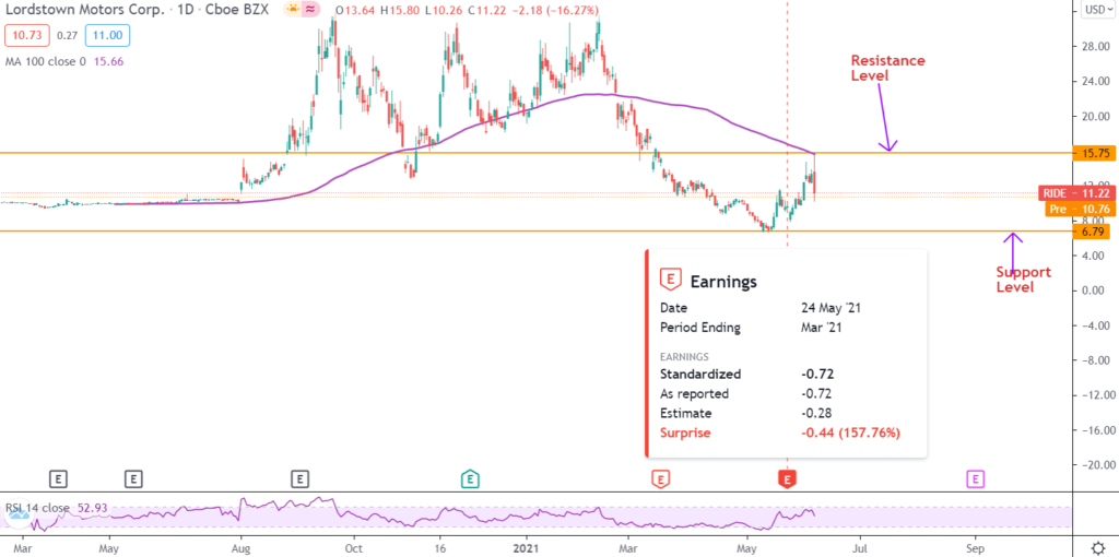 Lordstown deve ancora iniziare a realizzare profitti, e questa è una preoccupazione per qualsiasi azienda. RIDE ha riportato una perdita nel primo trimestre di $125 milioni o -$0,72 per azione, che ha mancato le aspettative degli analisti del 157%. La società ha sollevato preoccupazioni in merito alla disponibilità di fondi per il suo progetto di camion elettrici.