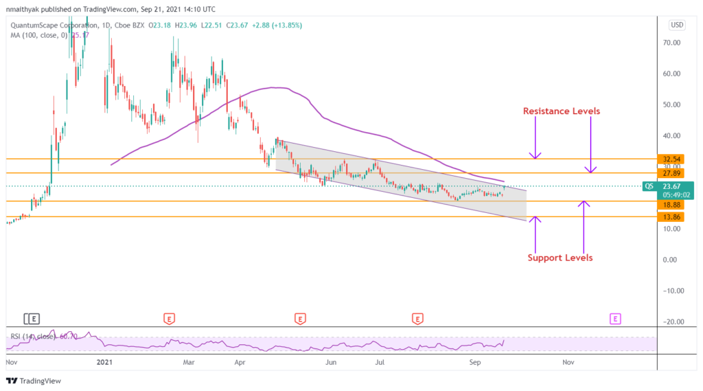 Tecnicamente, le azioni di QuantumScape sembrano aver recentemente registrato un picco dopo la divulgazione dell’accordo OEM di martedì. Tuttavia, il prezzo delle azioni sembra incontrare una resistenza intorno al livello di 23,70 dollari, creando un’opportunità perfetta per un pullback.