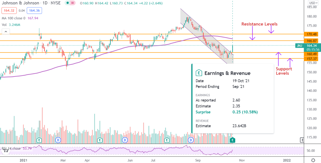 Tecnicamente, le azioni Johnson & Johnson sembrano aver recentemente fatto un breakout al rialzo da una formazione di canali discendenti.