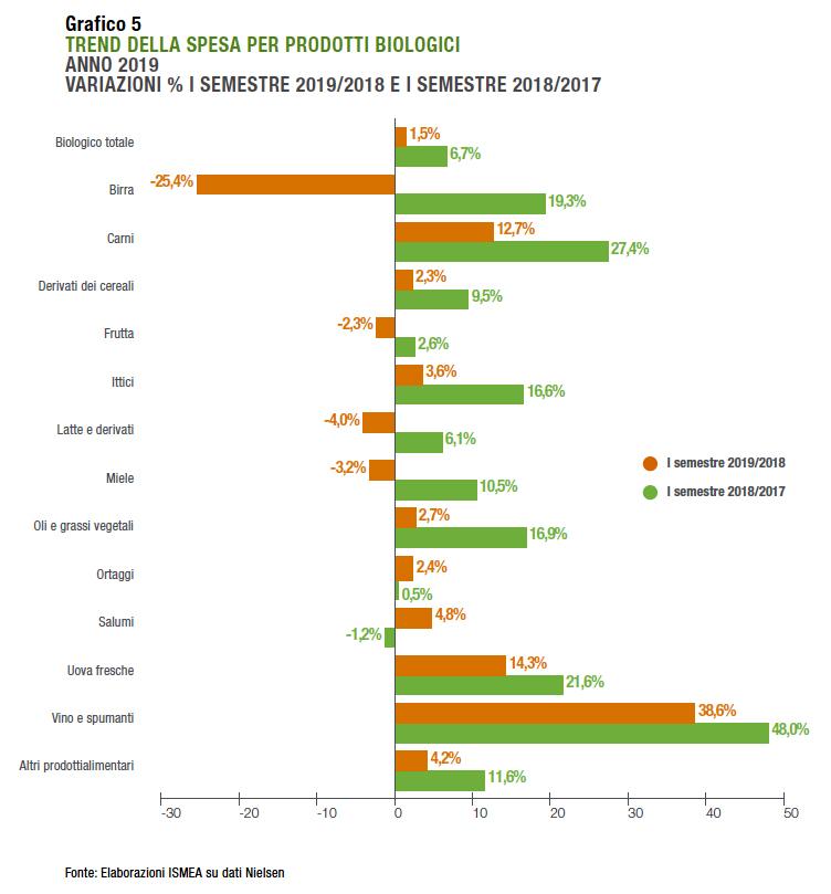 Nel 2018 la spesa per i prodotti alimentari biologici ha sfiorato i 2,5 miliardi di euro, raggiungendo una quota del 3% sul valore complessivo dell’agroalimentare. La crescita nel primo semestre del 2019 si è limitata a un +1,5% rispetto all’analogo periodo del 2018, in rallentamento rispetto ai tassi a cui il settore ci aveva abituato nel passato. La ragione di questa decelerazione, spiega l’Ismea, va cercata nella dimensione ormai importante del giro d’affari del settore, che rende fisiologico un aumento più contenuto anno su anno.