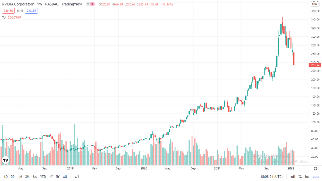 Nvidia Corporation (NASDAQ:NVDA) è stato uno dei titoli con le migliori performance del 2021. Tuttavia, come tutti gli altri titoli, ha subito un duro colpo nelle ultime settimane.