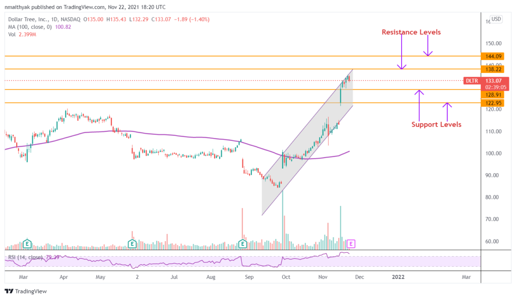 Tecnicamente, le azioni di Dollar Tree sembrano essere scambiate all’interno di una formazione di canale ascendente nel grafico intraday. Di conseguenza, il titolo è salito alle condizioni di ipercomprato dell’indice di forza relativa a 14 giorni.