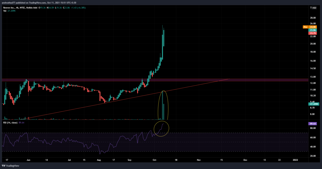 Venerdì Ren ha chiuso $7,38 in più rispetto al prezzo di chiusura di giovedì, un aumento del 44% in un solo giorno, ma Ren sarà in grado di sostenere questo enorme picco? Diamo un’occhiata al grafico e vediamo se riusciamo a trovare qualche indizio.