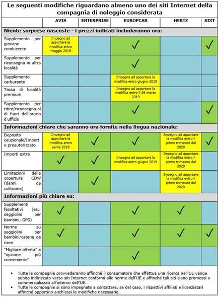 Finora le compagnie non avevano dato completa attuazione ad alcuni degli impegni assunti per poter essere considerate pienamente conformi alla normativa Ue, mentre ora Enterprise e Sixt hanno ormai apportato tutte le modifiche necessarie; Avis si è impegnata ad apportare le restanti modifiche entro maggio 2019; Europcar, di cui ora fa parte anche Goldcar, lo farà entro giugno 2019 ed Hertz si è impegnata ad apportare tutte le modifiche necessarie al più tardi entro il primo trimestre del 2020.
