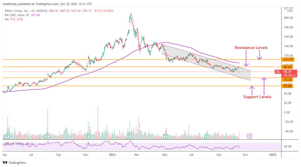 Tecnicamente, le azioni Zillow sembrano essere scambiate all’interno di una formazione di canale discendente nel grafico intraday. Inoltre, lunedì il titolo è sceso bruscamente, spingendo il titolo più vicino a condizioni di ipervenduto.