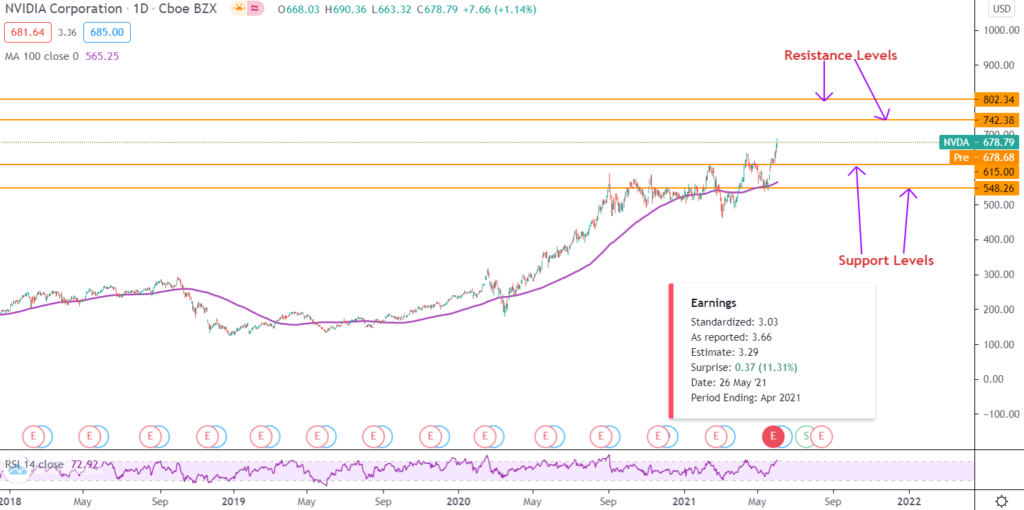 Le azioni Nvidia sembrano essere recentemente rimbalzate dalla media mobile a 100 giorni nel grafico giornaliero. Giovedì, il titolo è salito a un nuovo massimo storico di $690,36 prima di ritirarsi leggermente per chiudere a $678,79. Le azioni NVDA sono ora più vicine al passaggio ai livelli di ipercomprato dell’RSI a 14 giorni. Questo spiega perché si è leggermente ritirato prima che i mercati chiudessero ieri.