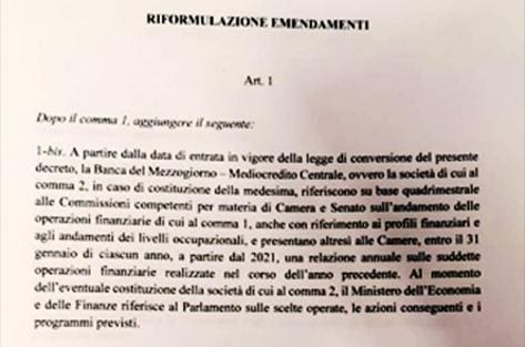 Mcc dovrà riferire su base quadrimestrale alle commissioni competenti di Camera e Senato «anche con riferimento ai profili finanziari e all’andamento dei livelli occupazionali», presentando inoltre alle Camere entro il 31 gennaio di ogni anno, a partire dal 2021, una relazione annuale sulle operazioni finanziarie realizzate nell’anno precedente. Anche il ministero dell’Economia dovrà riferire al Parlamento nel momento in cui fosse costituita la nuova società veicolo destinata a controllare le nuove partecipazioni bancarie nel Mezzogiorno.