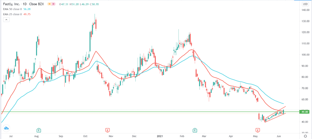 Il grafico giornaliero mostra che il titolo Fastly ha realizzato un modello double-top tra ottobre e febbraio di quest’anno. La neckline di questo modello era a $58, che ha attraversato dopo i deboli guadagni. Le azioni si sono anche spostate al di sotto delle medie mobili esponenziali a 25 e 50 giorni (EMA) e hanno formato quello che sembra un pattern island di inversione. Pertanto, mentre il titolo si riprenderà a lungo termine, probabilmente vedrà una certa debolezza nel breve termine.