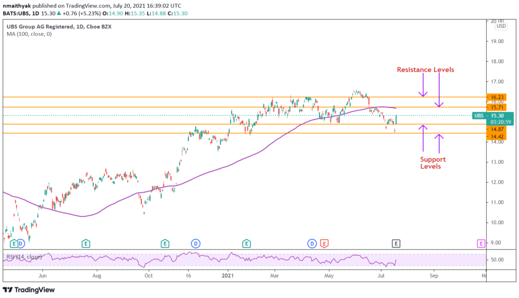 Tecnicamente, le azioni UBS sembrano essersi recentemente riprese per evitare di scendere alle condizioni di ipercomprato dell’indice di forza relativa a 14 giorni. Il prezzo delle azioni della società è sceso al di sotto della media mobile a 100 giorni, ma sembra destinato a salire al di sopra dopo il rimbalzo di martedì.