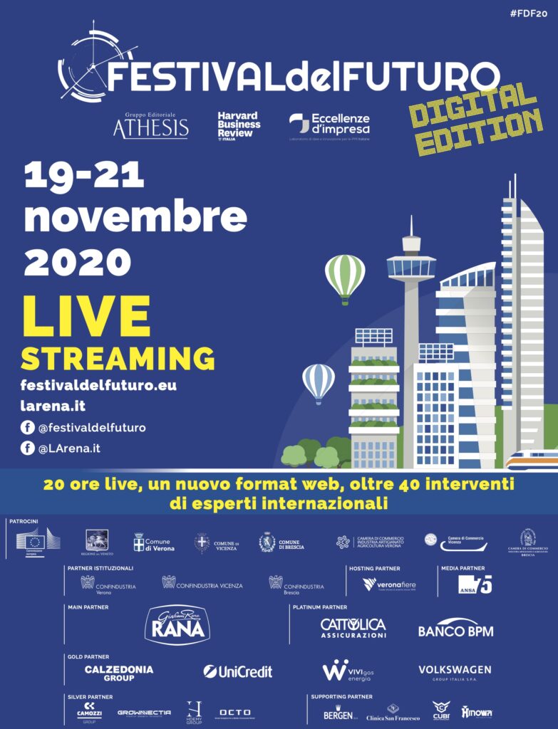 Il festival, promosso da Gruppo editoriale Athesis, Eccellenze d’Impresa e Harvard Business Review con il titolo «Disegnare il nuovo mondo», si svolge dal 19 al 21 novembre in diretta web con oltre 40 ospiti e 20 tra dibattiti, keynote speech e interviste. L’evento sarà trasmesso in streaming sui siti del Festival del Futuro (festivaldelfuturo.eu), dei quotidiani L’Arena, Il Giornale di Vicenza e Bresciaoggi, delle tv TeleArena e TeleMantova e di Radio Verona, oltre che sulle rispettive pagine Facebook.