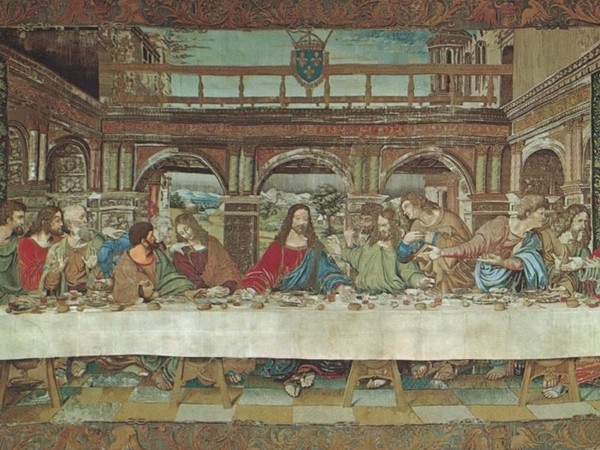 L’arazzo, che fu tessuto probabilmente in Fiandra su cartone di un artista lombardo (forse Bramantino?), rappresenta una delle primissime copie del capolavoro di Leonardo, realizzata per soddisfare le esigenze della corte francese che intendeva portare con sé l’immagine di un’opera che non poteva in alcun modo essere trasportata.