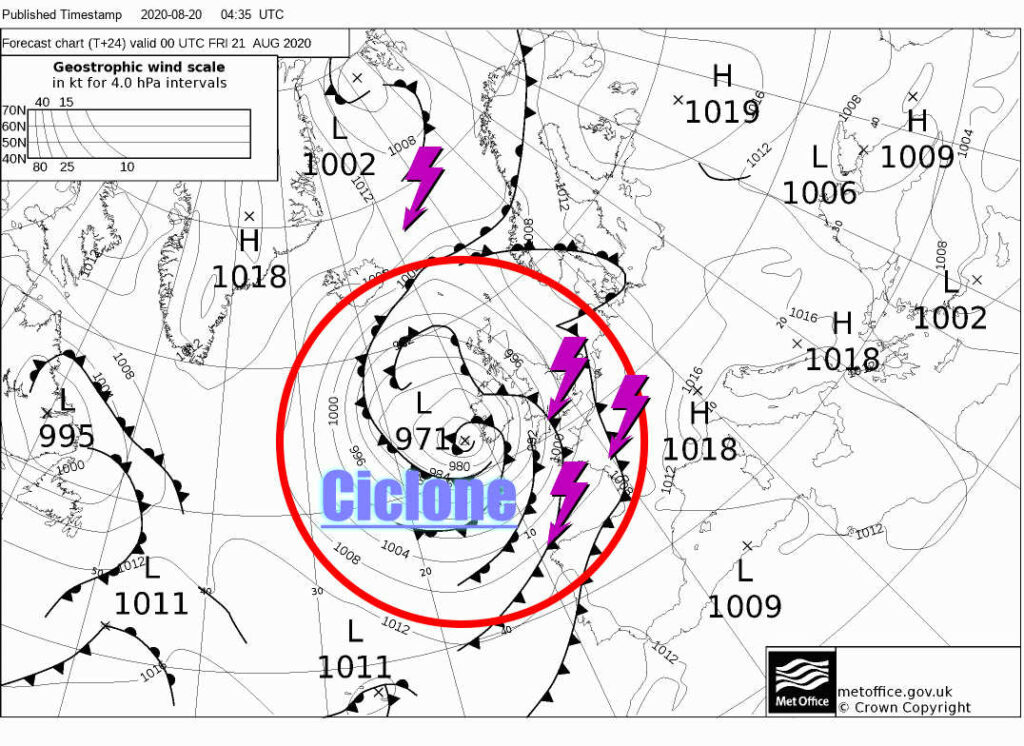 Un profondo minimo di Bassa Pressione è in prossimità dell’Irlanda, e nelle Isole Britanniche e la Bretagna è scattata l’allerta meteo per condizioni atmosferiche avverse, con forti venti, anche di oltre i 1200 km orari, piogge incessanti. Rischio di alluvioni lampo come è avvenuto l’altro giorno in Irlanda.