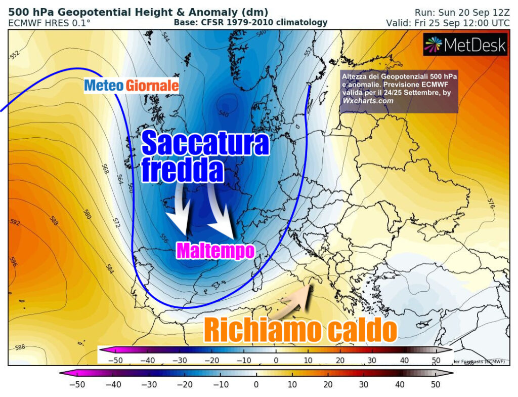 L’ultima decade di settembre si preannuncia quindi dal sapore autunnale. Le perturbazioni raggiungeranno con facilità l’Italia, in quanto la modesta area ciclonica tra Spagna e Francia sta per essere agganciata dal flusso oceanico che spodesterà l’anticiclonica e determinerà l’affondo di una saccatura sull’ovest Europa.