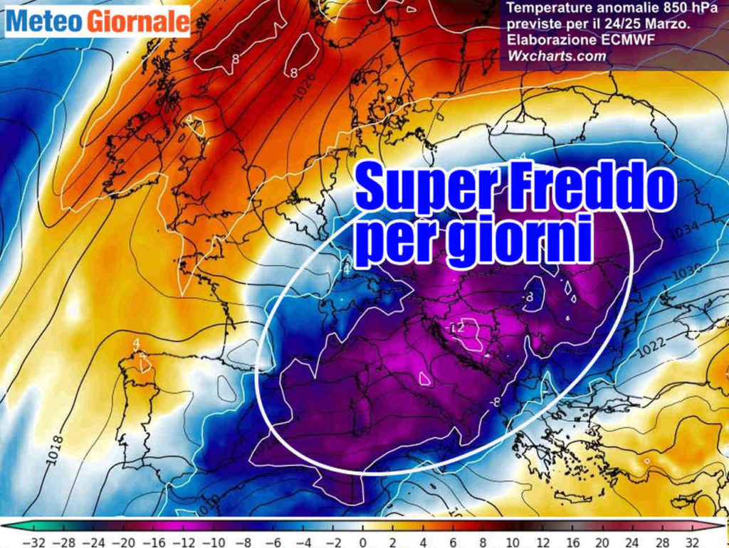 Il grosso del freddo è atteso sopraggiungere ad inizio settimana, quando affluiranno masse d’aria più continentali e ancor più rigide nei bassi strati. Si tratta di un’irruzione davvero eclatante per il periodo, che avviene quindi a primavera ormai iniziata e dopo un inverno rimasto del tutto in letargo.