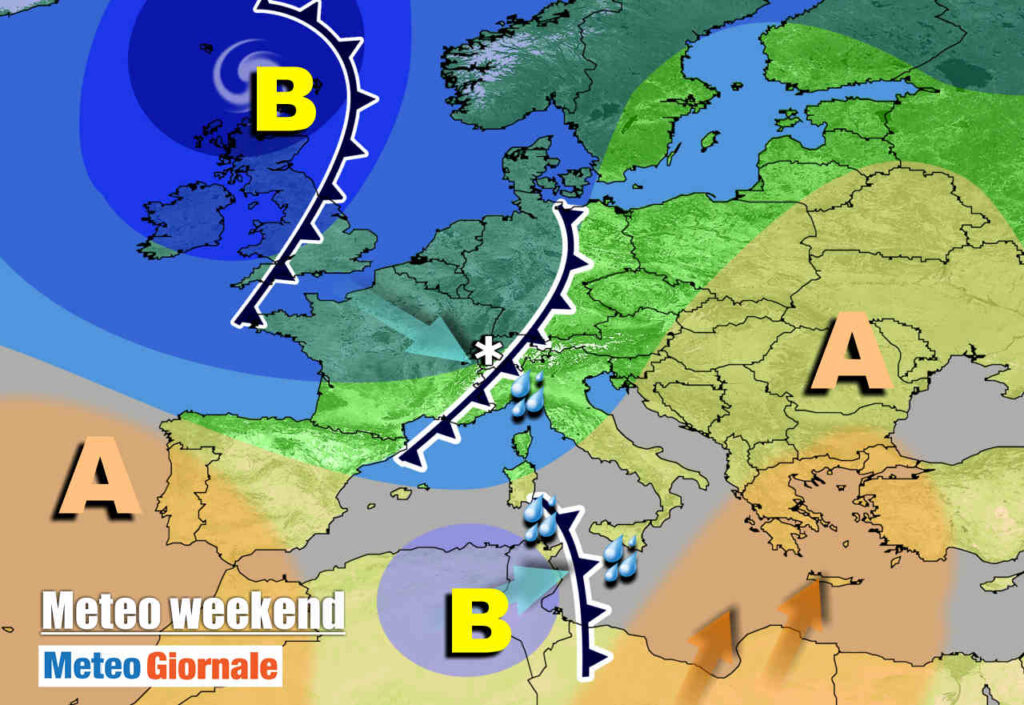 Questo ammasso perturbato tenterà di smantellare il campo di alta pressione presente alle latitudini mediterranee, senza però raggiungere tale obiettivo. il guasto meteo del fine settimana si percepirà solo su alcune regioni, poiché l’alta pressione riuscirà in parte a contenere gli effetti della perturbazione. Il flusso di correnti oceaniche trasporterà aria ancora mite.