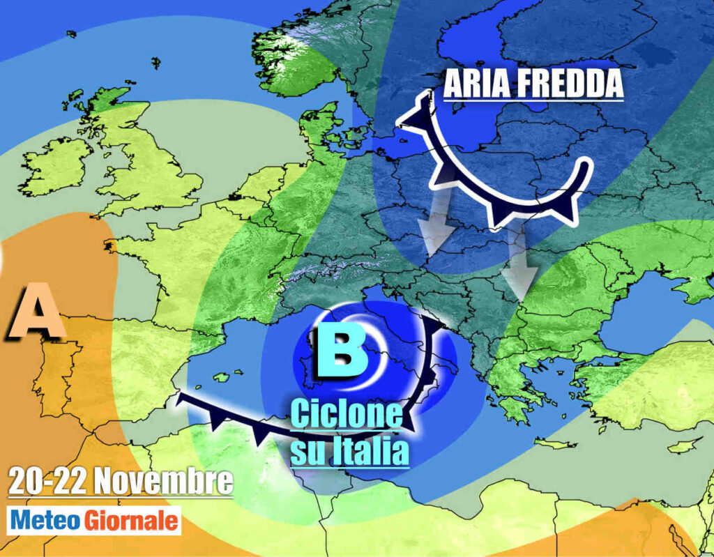 Un minimo depressionario si svilupperà ed approfondirà sul Tirreno, una volta che l’aria fredda aggirerà le Alpi iniziando a penetrare dalla Valle del Rodano e poi dalla Porta della Bora. Il tempo diverrà assai turbolento prima sul Centro Italia e poi al Sud, con la neve che cadrà in Appennino a quote via via più basse.