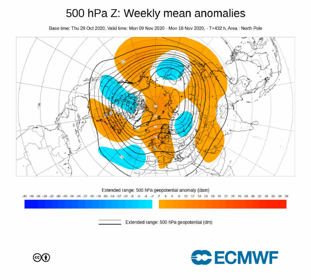 Spostandoci in Europa, uno spostamento delle depressioni nell’Atlantico settentrionale dovrebbe contribuire a rafforzare il sistema anticiclonico sulla Scandinavia (a causa della circolazione meridionale che andrà a instaurarsi tra i due sistemi). La configurazione barica che abbiamo appena descritto potrebbe tradursi, semplificando all’eccesso, condizioni climatiche più miti per il vecchio continente.