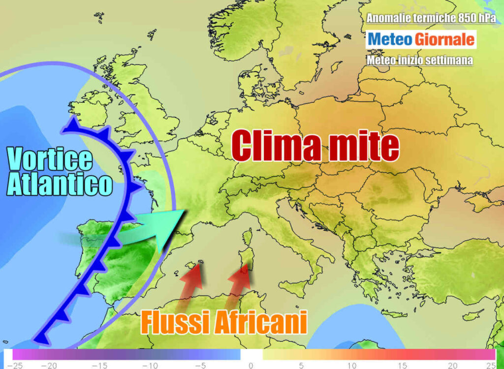 Sulle regioni settentrionali è si farà sentire il respiro più umido atlantico, collegato alla giostra depressionaria con perno tra Regno Unito e Francia. L’anticiclone potrebbe però reggere, seppur indebolito, sul resto d’Italia e in particolare al Sud. Solo verso il weekend si potrebbe far strada un guasto meteo più pronunciato al Nord, sulle aree tirreniche e sulle due Isole Maggiori.