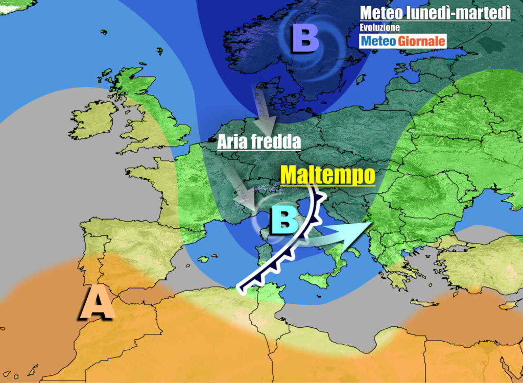 Inizialmente parte del Centro-Sud sarà ai margini del maltempo, ma poi piogge e temporali tra martedì e mercoledì tenderanno a portarsi prima sul Centro Italia e poi anche sul Sud, a partire dalla Campania, spodestando lo scirocco con aria più fredda da nord. Il vortice ciclonico tenderà a spostarsi prima verso l’Adriatico e poi sui Balcani.