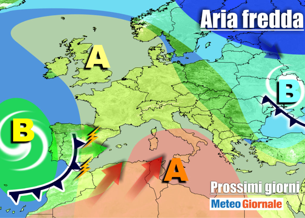 Al seguito della perturbazione e dell’aria fredda al seguito, l’anticiclone subtropicale tornerà sull’Italia, riportando tempo stabile e con temperature in progressivo aumento a partire dal Nord e dalle regioni del versante tirrenico. Il rinforzo dell’alta pressione verrà incentivato dalla presenza di un vortice ciclonico sul Vicino Atlantico, appena ad ovest della Penisola Iberica.