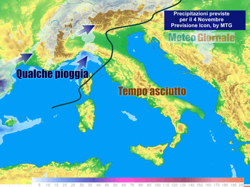 La parte più attiva della perturbazione caratterizzerà il meteo di domani, mercoledì 4 novembre. La copertura nuvolosa sarà più compatta, con precipitazioni più diffuse ma sempre di debole intensità, con fenomeni che potranno risultare più incisivi sulla Liguria centro-orientale.