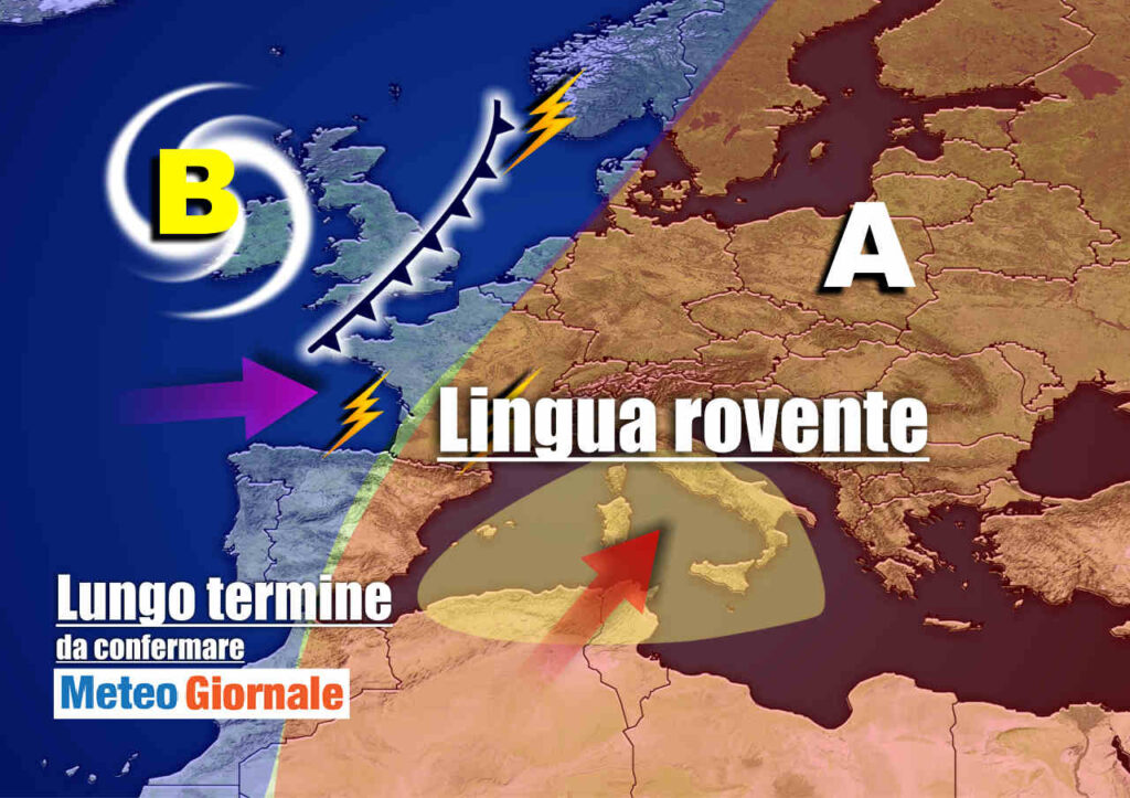 Nell’ambito di tale ricollocazione barica, sul Mediterraneo potrebbero realizzarsi scenari differenti. Anzitutto potremmo assistere a una fiammata africana ancor peggio delle precedenti, o comunque non dissimile. Ma trattandosi di fiammata potrebbe essere temporanea e nell’ultima settimana d’agosto potrebbero arrivare le correnti atlantiche.