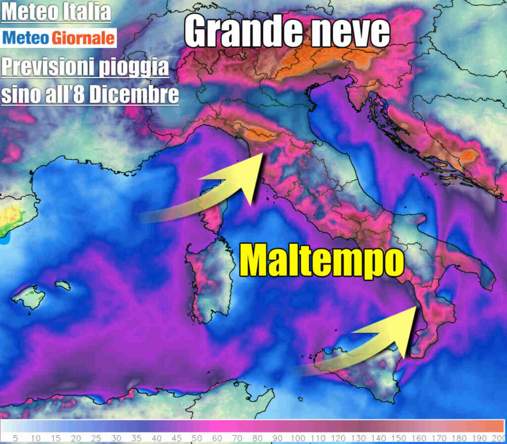 Le piogge previste da qui ai prossimi 5 giorni sull’Italia sono davvero di entità localmente mostruosa. Possiamo vedere come fenomeni particolarmente abbondanti riguarderanno le aree alpine (nevicate clamorose in alta quota), la fascia tirrenica e alcune zone del Sud.