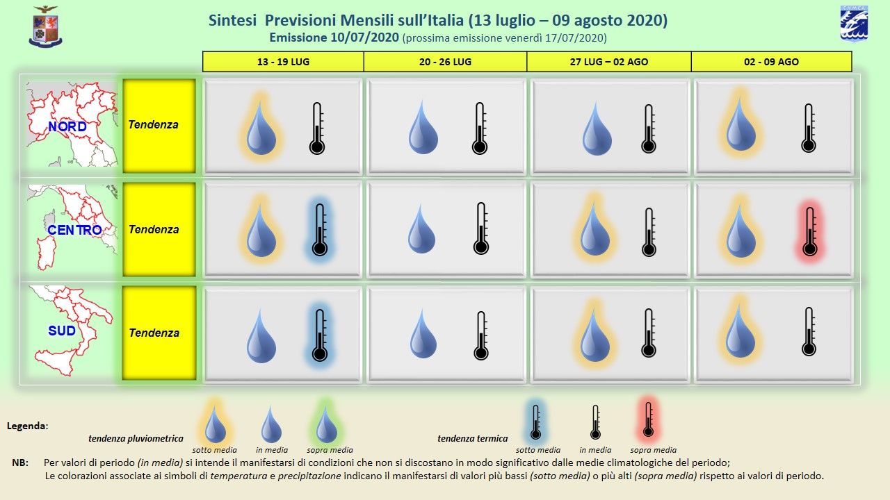 Da quel che emerge dal bollettino, in una visione d’insieme, avremmo la possibilità che si manifesti una serie di periodi con temperature addirittura sotto la media tipica del periodo. Ciò dovrebbe succedere in quello che è il periodo di maggior calura della stagione estiva.