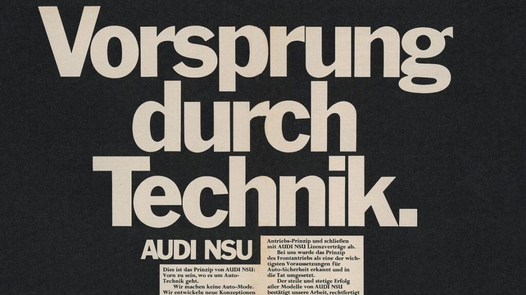 Nel 1970 il reparto marketing coniò il celebre claim “All’avanguardia della tecnica” che l’anno successivo fece la sua comparsa per la prima volta in una pubblicità di grande formato. Dopo alcune variazioni sul tema lo slogan “Vorsprung durch Technik” diventò parte integrante della filosofia aziendale dall’ottobre 1986, quando fece la sua comparsa all’interno della brochure realizzata per la Audi 80. Dal prossimo dicembre, con la mostra “Living Progress – 50 anni All’avanguardia della tecnica”, la casa di Ingolstadt offrirà ai visitatori dell’Audi Forum di Neckarsulm alcuni pilastri della tecnica, portacolori dei valori più vicini al motto Vorsprung durch Technik.