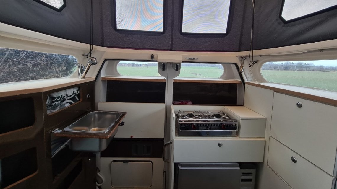 Cabineer è compatto, leggero e dall’interno multifunzione in grado di ospitare due adulti e due bambini; ogni angolo è pensato e sfruttato al massimo. All’interno ci sono attrezzature dai mille impieghi e a scomparsa, non manca nulla: dall’angolo cucina composto di due fuochi, una stufa e un frigo ai piani di lavoro pieghevoli. Il lato toilette è nascosto, messo sotto la finestra e il divano avvolgente, la sera diventa un comodo letto. Il mezzo è dotato di una batteria al litio da 100 Ah cablata e due pannelli solari da 100 W, un serbatoio di acqua potabile da 100 litri.