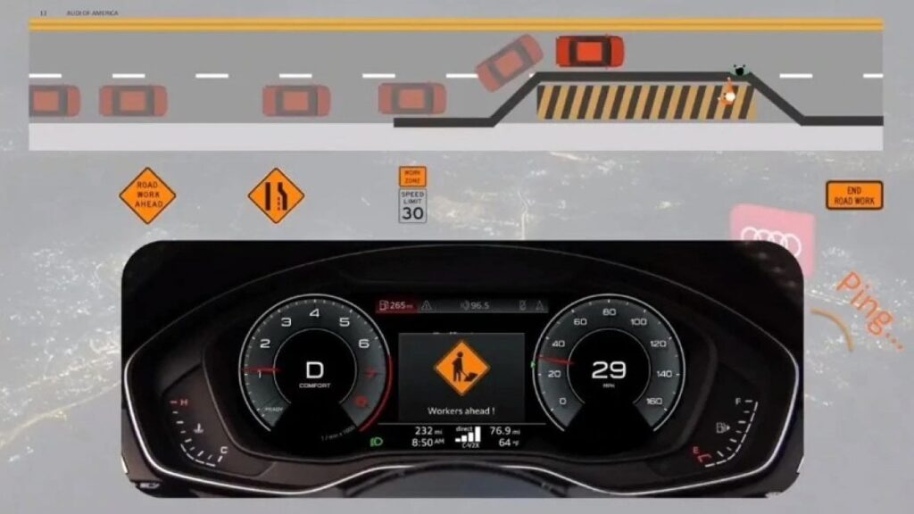 Lo stesso procedimento avviene quando ci quando ci sono lavori in corso, argomento caldo negli USA dove ogni anno sono circa 36 mila le persone coinvolte in incidenti in corrispondenza di cantieri stradali: la media di un ferito ogni 14 minuti e un decesso ogni 15 ore. “L’implementazione del C-V2X sul Virginia Smart Road Corridor consente una nuova generazione di veicoli in grado di comunicare direttamente con le infrastrutture stradali e gli utenti vulnerabili della strada”, ha dichiarato Pom Malhotra, direttore di Connected Services, Audi of America. “La pietra miliare di oggi permetterà ad Audi di aumentare la fiducia del guidatore sulla strada, fornendo avvertimenti e in futuro intervenire autonomamente quando si percepisce una collisione imminente o anche una violazione delle regole del traffico”.