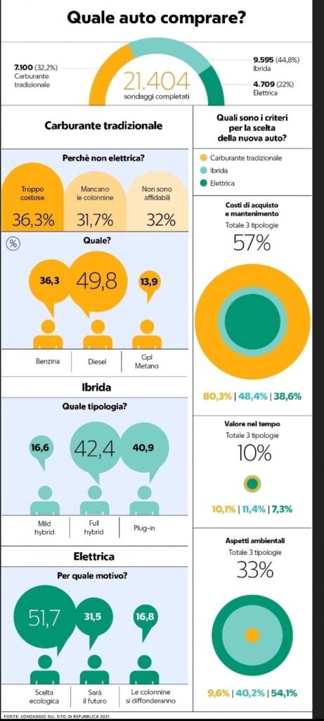 ROMA – Tempo di transizione ecologica e quindi anche di scelte importanti. Soprattutto quando si tratta di cambiare automobile. Per questo abbiamo cercato di capire come la pensano realmente gli italiani sull’argomento e quali ostacoli potrebbero rallentare il cambiamento. Lo abbiamo fatto attraverso il sondaggio effettuato in collaborazione con il portale AutoXY (che è stato online in questi giorni sul nostro sito) . Oltre 21.500 utenti hanno risposto alle nostre domande, un campione molto vasto di persone “intenzionate” ad acquistare una nuova automobile che ci ha permesso così di capire un po’ meglio la reale situazione.