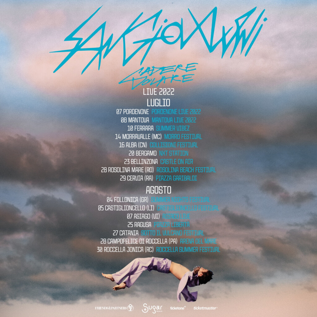 Sangiovanni annuncia le date estive del CADERE VOLARE LIVE 2022, prodotto e organizzato da Friends & Partners in collaborazione con Sugarmusic. Il tour estivo arriva a grande richiesta dopo il sold out di tutte le date di maggio nei superclub e l’aggiunta dei due palasport il 19 OTTOBRE A ROMA (Palazzo dello Sport) e il 23 OTTOBRE A MILANO (Forum di Assago).