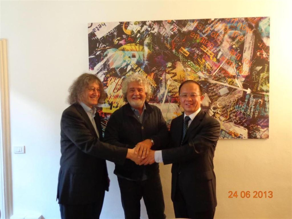 La risposta è in questa foto scattata il 24 giugno 2013 nella quale compaiono i due fondatori, Gianroberto Casaleggio e Beppe Grillo, accanto all’ambasciatore cinese Ding Wei. Più che una stretta di mano sembra una rimpatriata tra vecchi amici, la stipula di un patto, una mano sopra l’altra.