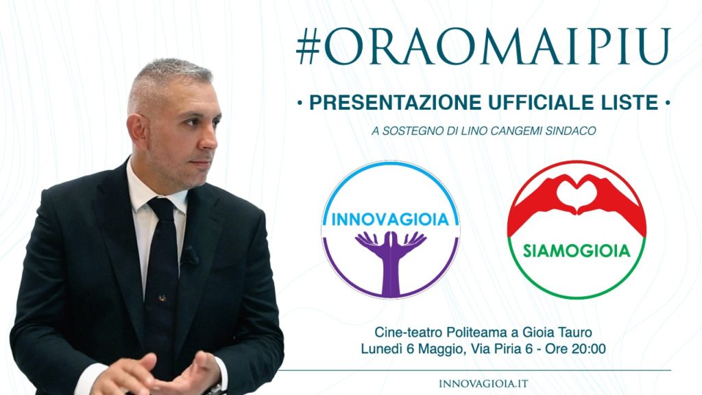 La presentazione targata Cangemi, fuori dai classici schemi, sarà una vera e propria rivoluzione 2.0, e già dalla presentazione delle liste, grazie al suo staff di comunicazione, farà capire quanto è vera e viva in tutti i candidati la voglia di Innovare Gioia Tauro. La cittadinanza è invitata a partecipare>>.