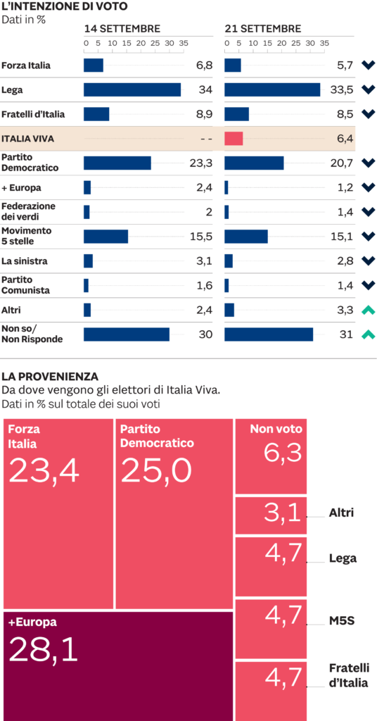 Con questa percentuale Italia Viva si colloca al quinto posto, dopo Fratelli d’Italia e prima di Forza Italia. Come era prevedibile i suoi consensi vengono quasi tutti da quel bacino elettorale che va dal Pd al partito di Berlusconi. A livello di schieramenti, l’area di centro sinistra, prima dell’arrivo di Italia Viva valeva il 27,7%, ora vale il 29,7%
