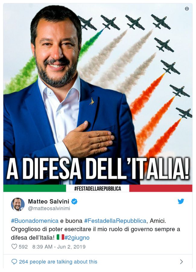 Di oggi invece il tweet con cui il vicepremier Matteo Salvini si è detto «Orgoglioso di poter esercitare il mio ruolo di governo sempre a difesa dell’Italia!», postando una sua foto con le Frecce Tricolori sullo sfondo.