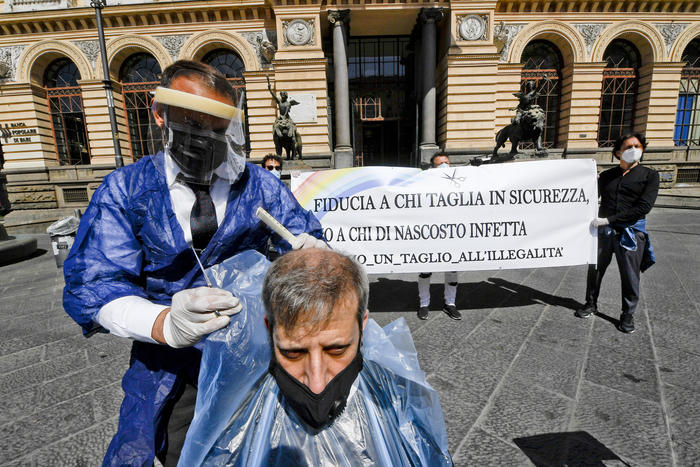 (ANSA) – NAPOLI, 30 APR – Taglio di capelli in piazza oggi a Napoli per sollecitare una rapida apertura, dopo il lockdown del Coronavirus, di barbieri e parrucchieri.